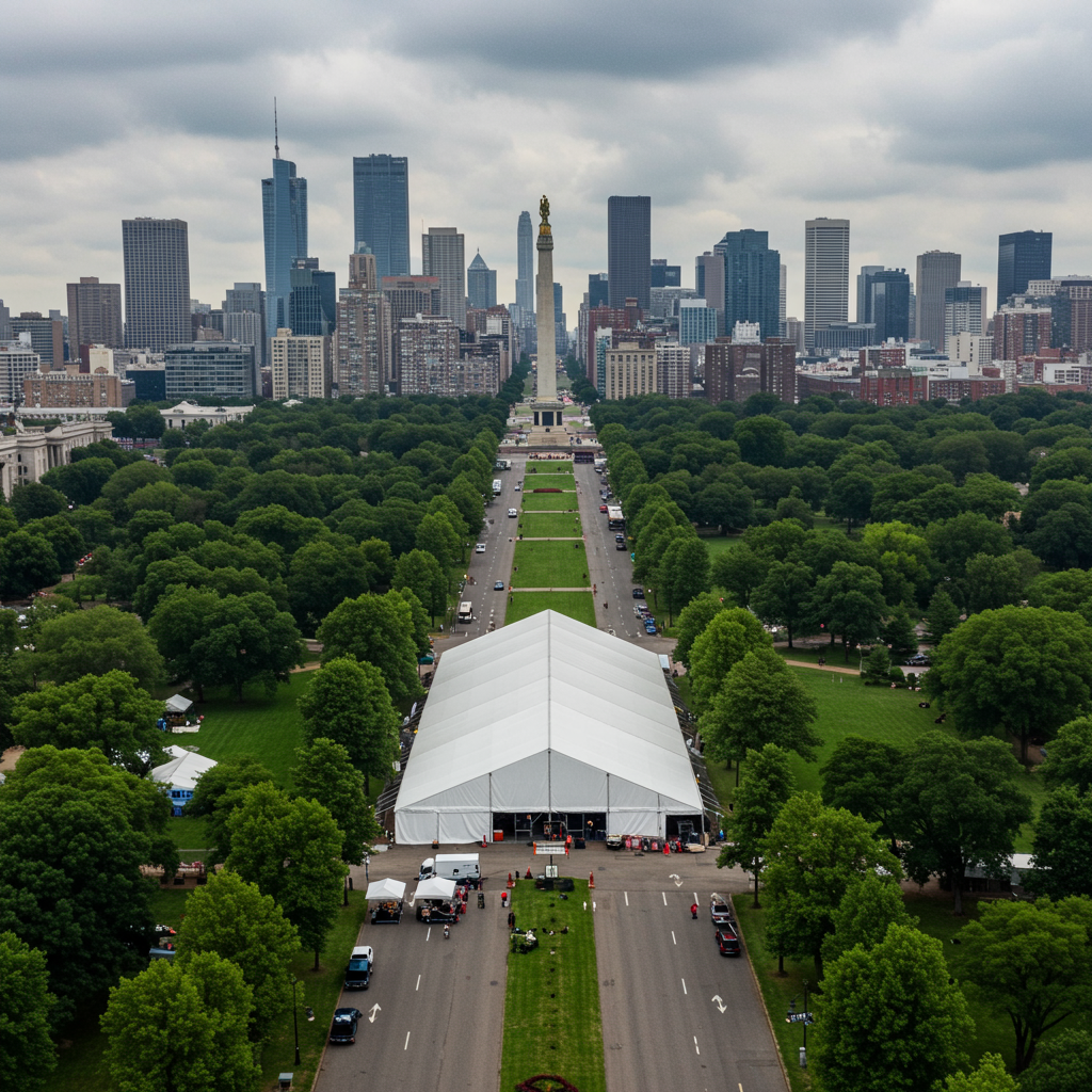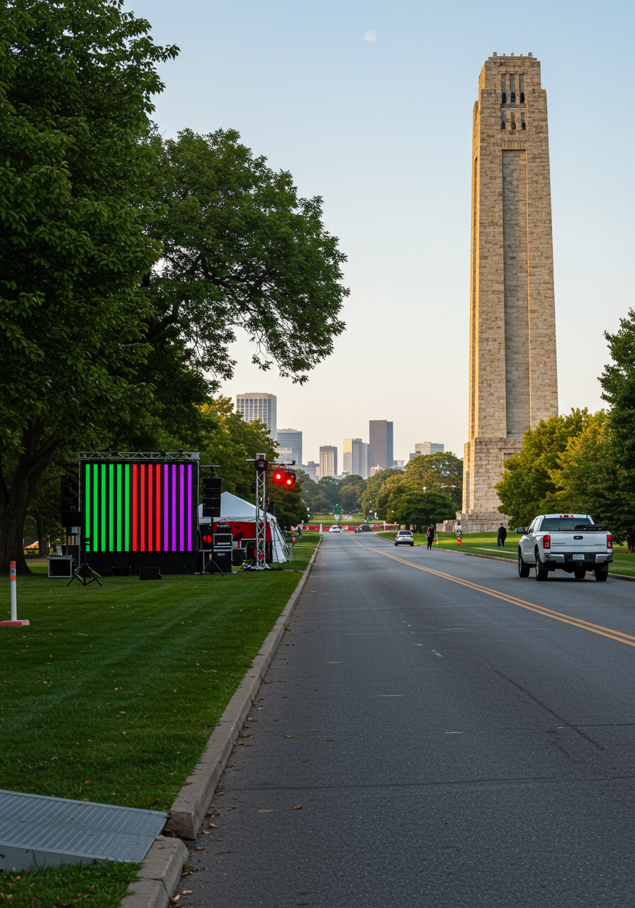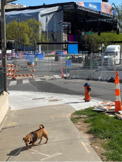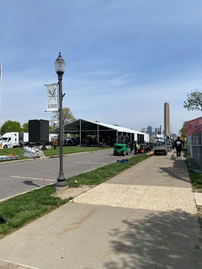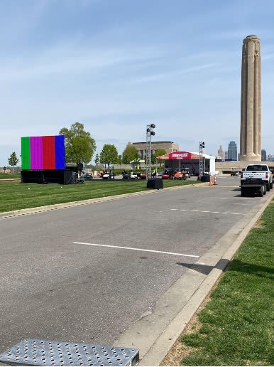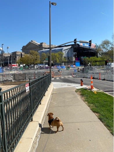 The NFL Draft arrives this week at Penn Valley Park and it’s spectacular! Every morning I usually walk my dog Roscoe at the park, however recently due to the preparation for the Draft I haven’t been able to do so. Well curiosity got the best of me. Today Roscoe and I went on our NFL adventure to see exactly what is going on at the Liberty Memorial grounds and it’s very exciting! Below are a few pictures of the construction and the VIP seating (which I wasn’t able to photograph) being constructed at the north end of the Memorial overlooking Union Station.